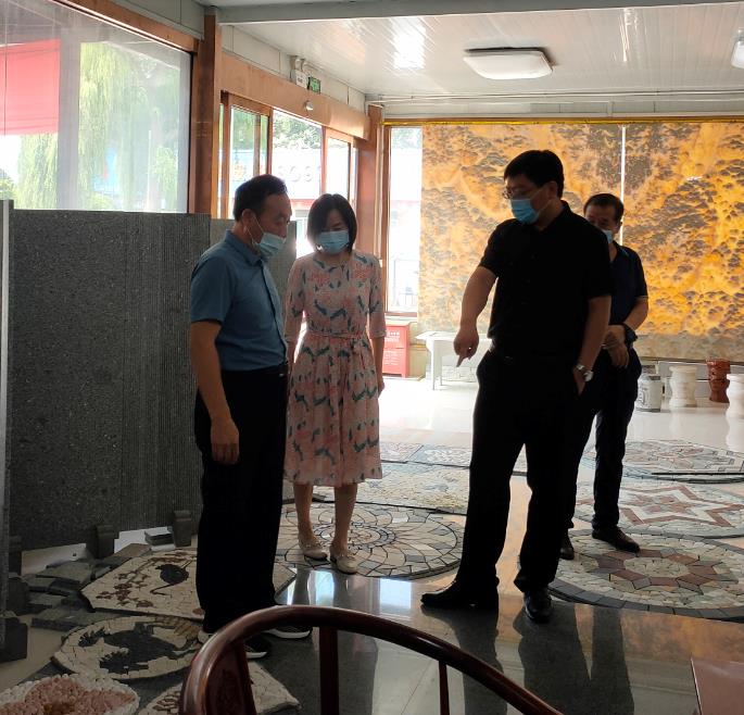 曹縣長(zhǎng)一行人首先參觀(guān)了龍山石材展廳,耿經(jīng)理為曹縣長(zhǎng)一行人介紹了企業(yè)主營(yíng)業(yè)務(wù)、主要產(chǎn)品等概況,并講述了易縣紅花崗巖,此石用于一九九九年50年祖國(guó)大慶時(shí)天安門(mén)廣場(chǎng)的鋪裝;還有二零零八年的北京鳥(niǎo)巢指定用綠色石材——青木紋板巖拼圖;最后介紹了易縣灰麻,被預(yù)定用于雄安的新建設(shè)中。
