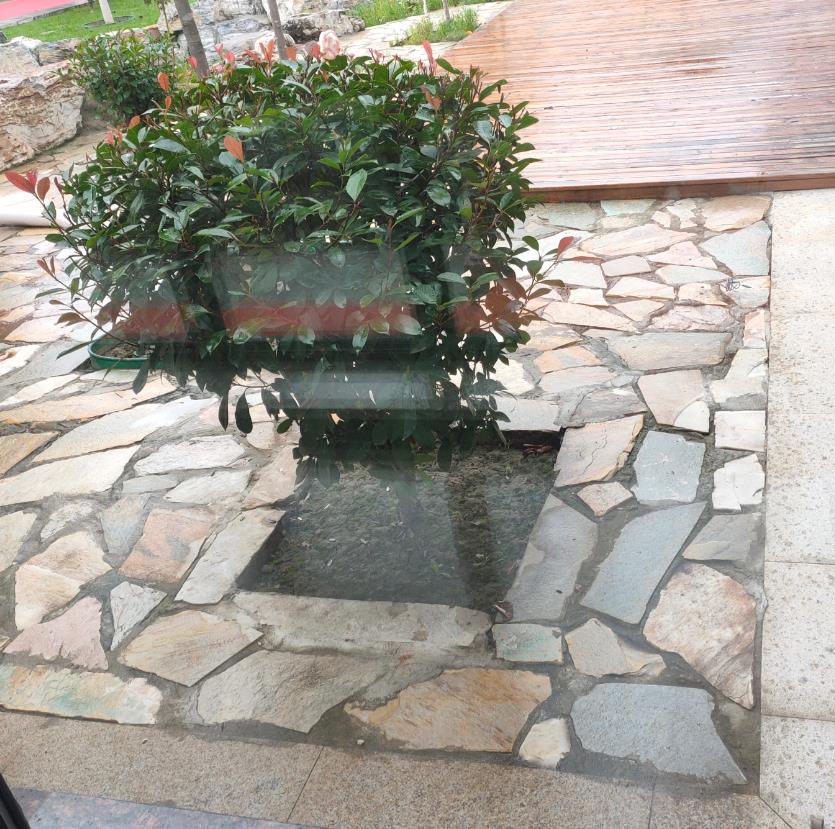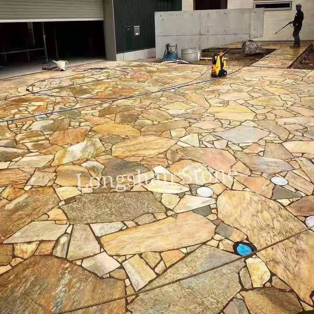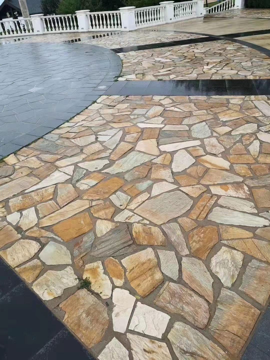 黃木紋碎拼是一種較為隨意的鋪裝方式。可以運用石材不同規格、不同形態,當然也可以做切割調整,便于在拼接時達到自己想要的形態。在精致優雅的庭院中任意隨性的形態組合打破常規,反而能帶來不一樣的韻味。