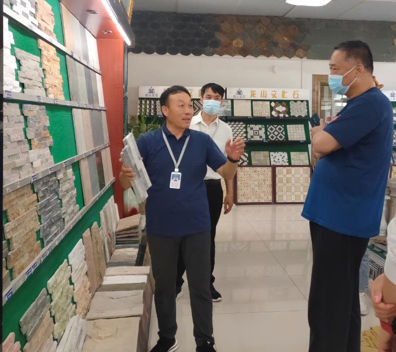 耿經理陪同張主任參觀龍山石材展廳,并介紹企業主營業務、主要產品等概況,講述了易縣紅花崗巖,此石用于一九九九年50年祖國大慶時天安門廣場的鋪裝;重點介紹了易縣灰麻,被預定用于雄安的新建設中。在文化石展區詳細介紹各類文化石的應用和鋪裝,還有二零零八年的北京鳥巢指定用綠色石材——青木紋板巖拼圖;